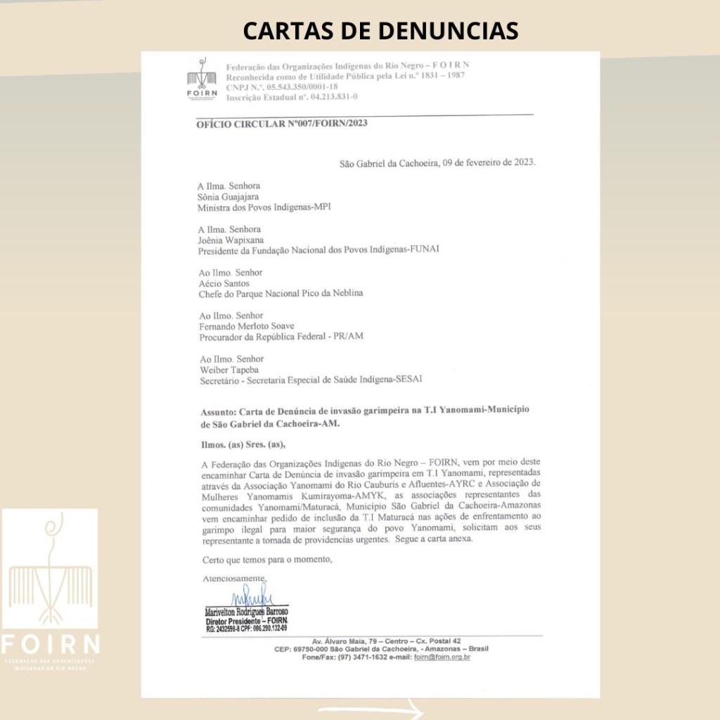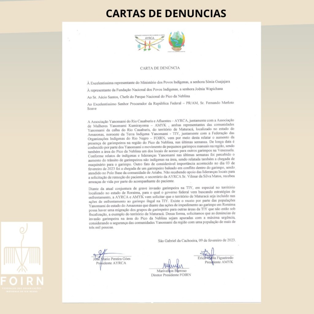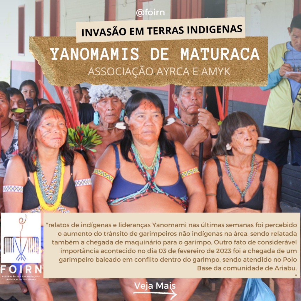 A Federação das Organizações Indígenas do Rio Negro – FOIRN encaminhou Carta de Denúncia de invasão garimpeira em TI Yanomami, representadas através da Associação Yanomami do Rio Cauburis e Afluentes-AYRC e Associação de Mulheres Yanomamis Kumirayoma-AMYK, as associações representantes das comunidades Yanomami/Maturacá, Municipio São Gabriel da Cachoeira-Amazonas vem encaminhar pedido de inclusão da T.I Maturacá nas ações de enfrentamento ao garimpo ilegal para maior segurança do povo Yanomami, solicitam aos seus representantes a tomada de providencias urgente.
