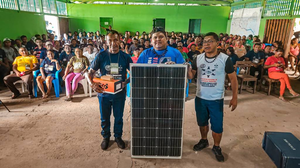 Marivelton Baré, diretor presidente e Adão Baré diretor da FOIRN entregaram mais sete kits de energia solar e três kits de antenas de internet via satélite starlink para as lideranças presentes na VII Assembleia Regional Ordinária Eletiva da CAIBARNX.