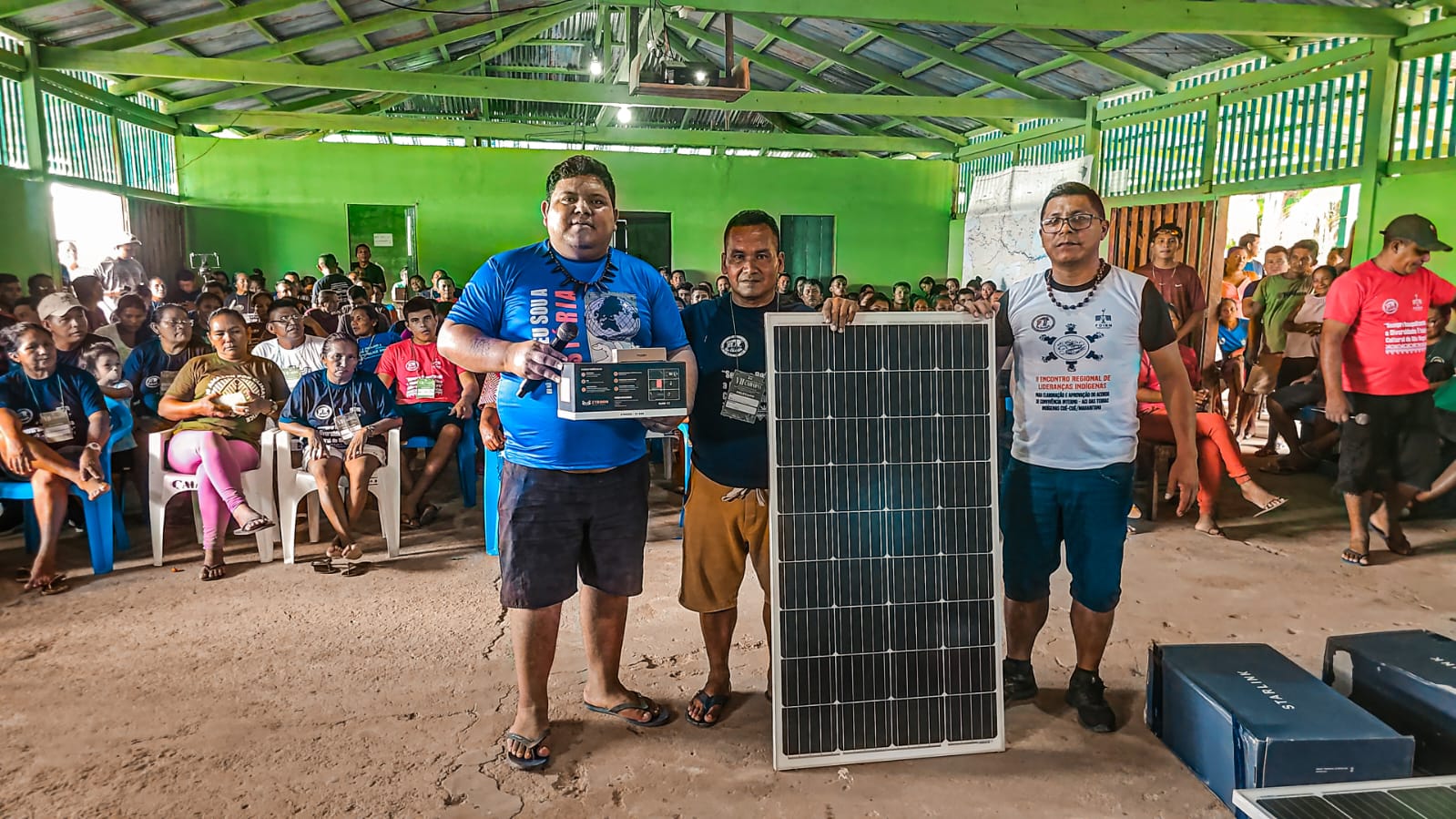 Marivelton Baré, diretor presidente e Adão Baré diretor da FOIRN entregaram mais sete kits de energia solar e três kits de antenas de internet via satélite starlink para as lideranças presentes na VII Assembleia Regional Ordinária Eletiva da CAIBARNX.