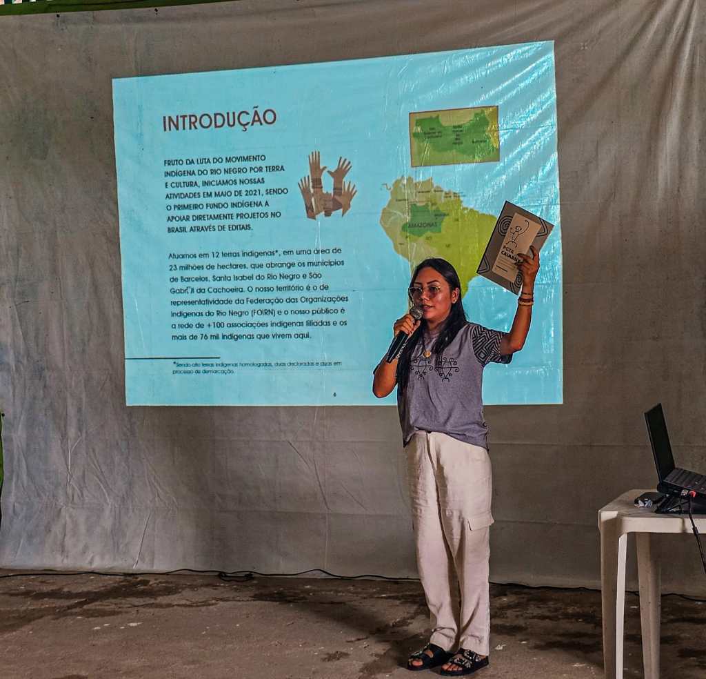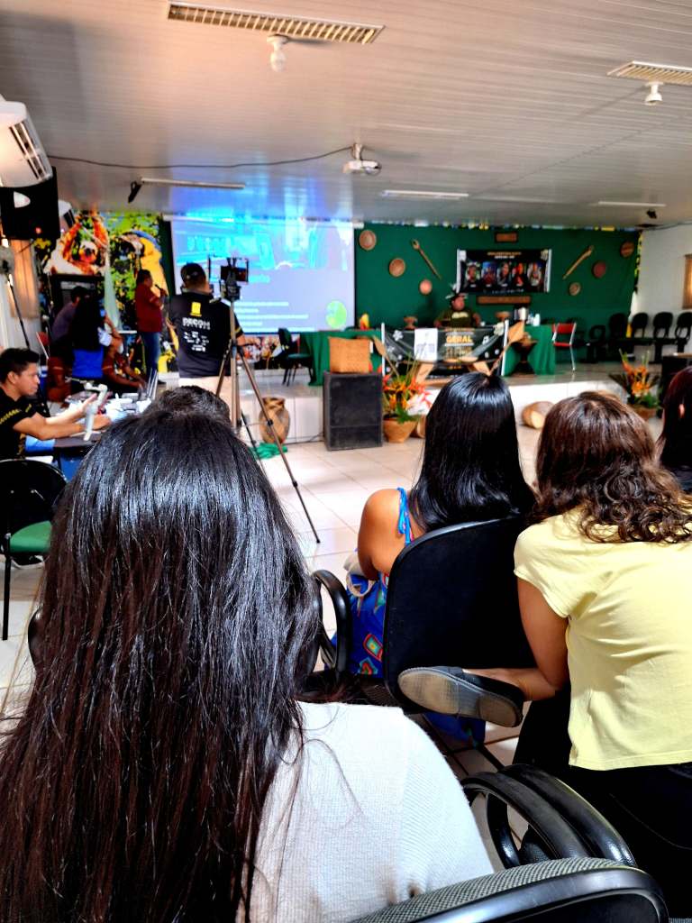 Na fala Marivelton Baré- Diretor Presidente da FOIRN. Foto: DECOM/FOIRNFoto: DECOM/FOIRNDadá Baniwa-Coord. FUNAI-CRRNG e Luciane Mendes – Coord. Depto. de Negócios da FOIRN, Nicole – Pesquisadora de Inteligência Artificial da USP, Josimara – Coord. FIRN, Janete Alves – Diretora de referência da COIDI, Hildete – Dpto. de Patrimônio Cultural e Dário Baniwa, diretor de referência da NADZOERI (não está na foto)