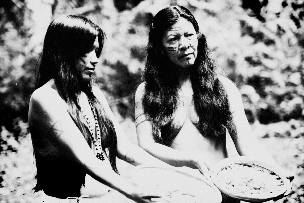Da esquerda para a direita: as lideranças Janete Figueiredo Alves e Almerinda Ramos de Lima mostram pimentas nos balaios para filmagem de cena da campanha do ISA #PovosDaFloresta, em Presidente Figueiredo (AM), fevereiro de 2019