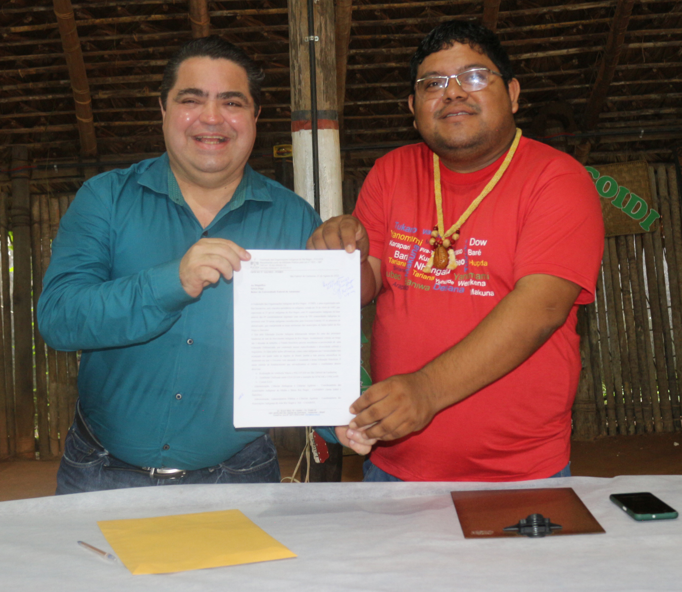 Estudantes entregando documento de reivindicação. Foto: ReproduçãoReitor recebendo o documento de demandas da formação Indígena. Foto: DECOM/FOIRNSylvio Puga e Marivelton Rodrigues Baré. Foto: DECOM/FOIRN