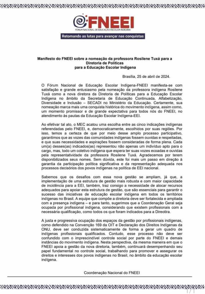 Manifesto do FNEEI para nomeação da diretora de politicas para Educação Escolar indígena