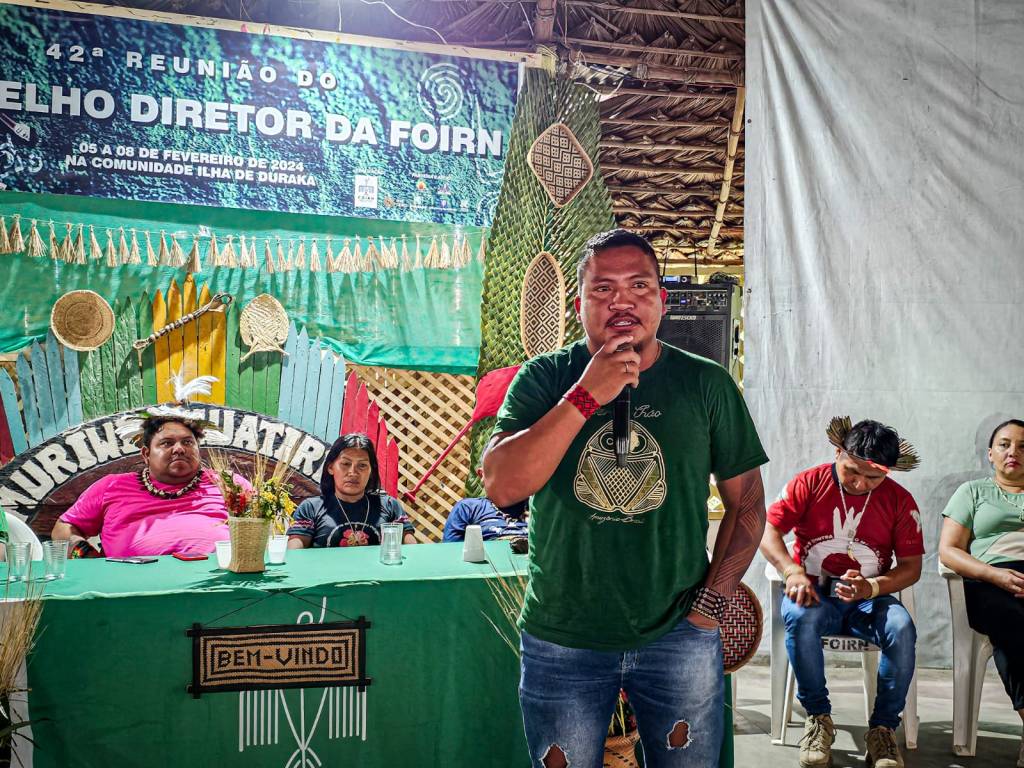 Marivelton Baré, como diretor presidente da FOIRN, lembrou da trajetória dessa organização desde sua formação, fundação e a luta contínua das lideranças indígenas ao longo dos anos. Essa organização foi fundada em 1987 e representa mais de 750 comunidades indígenas na região do Rio Negro, no estado do Amazonas.